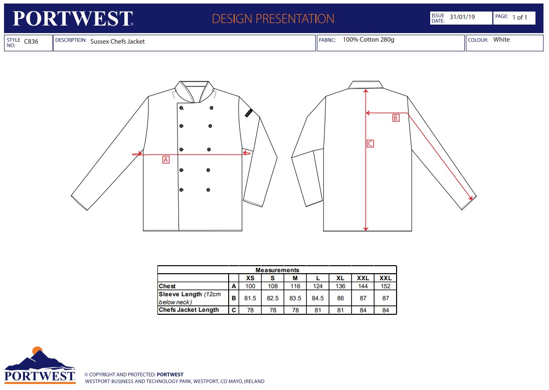 Portwest C836 Sussex Chefs Jacket L/S C836