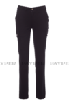 Women's trousers, classic cut, made of light stretch ripstop fabric, side elastics and waist belt loops, zip fastening with metal button, two classic front pockets, two side pockets with flaps and snap fasteners, one left zip pocket, one foldaway tape measure pocket on the right, two slit back pockets with button and buttonhole.