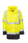 High visibility 4in1 two-tone parka. Unlined outer jacket, opening with plastic zip covered by a flap fastened with Velcro, foldaway hood, inset sleeves. 2 front pockets with flap and Velcro: right breast pocket with Velcro, smartphone holder and hook ring for badge holder inside; one internal pocket with Velcro. Two stripes around the chest, shoulders and sleeves. Heat-taped seams. Detachable and padded inner jacket with detachable sleeves, plastic zip opening, elasticated ribbed cuffs, two front zip pockets, one inside zip pocket, one stripe around the breast and two vertical ones on the shoulders.