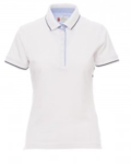 Women’s short-sleeved fitted polo shirt with 6 white buttons, inside collar, flap and side vents in Oxford blue, rib collar and sleeve edging with fine contrasting trim, underarm eyelets, side vents with reinforced seams, side reinforcement tape, stretch seams, inner neck tape