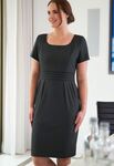 63% Polyester (30% Recycled), 34% Viscose, 3% LYCRA® Elastane. Curved neckline, satin stripe seam detail, pleats for ease of movement, princess seams, centre vent, centre back zip, short sleeve. centre back length @ 12R = 97cm